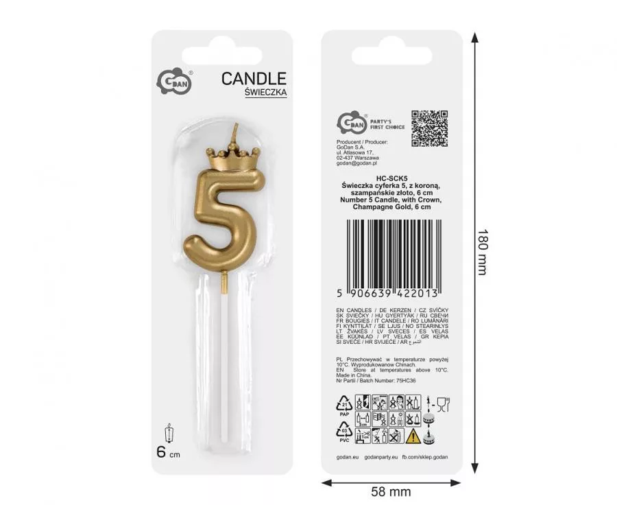 Numere Champagne Crown Lumânare cifră 5 aurie, lumânare de tort 6 cm