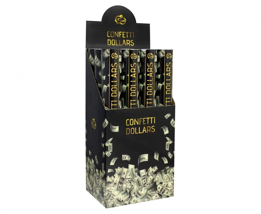 Prin rotirea bazei cilindrului în direcția săgeții, ejectează confeti.
